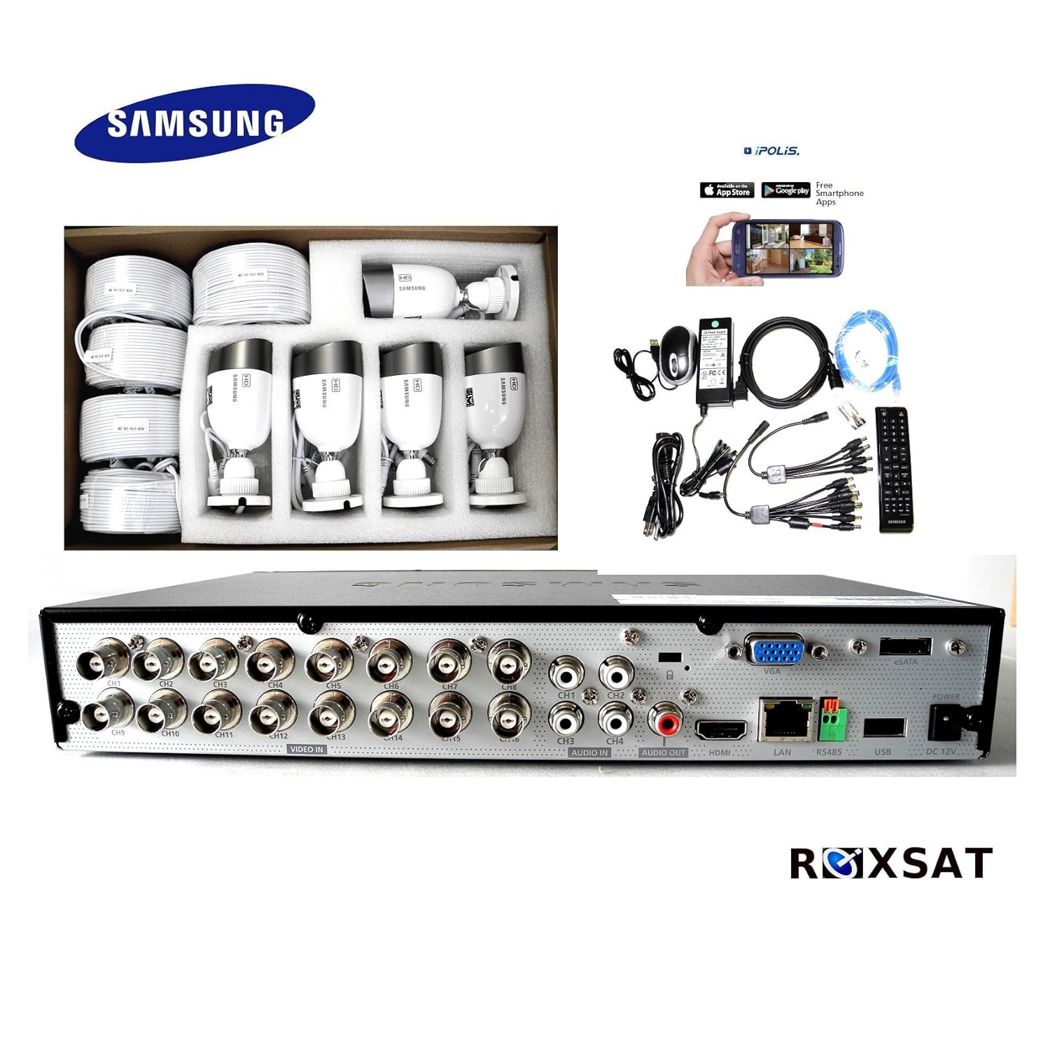 This 16-channel DVR kit includes 10 weather-resistant 1080p Full HD cameras that deliver true daylight color and clear night vision up to 82 feet. The system is easily customized for advanced monitoring and notification. Wide Angle Coverage Maximize your monitoring power with Samsung's 100° Ultra-Wide Angle lens. Expand your view without sacrificing crisp, clear details. Free Android and iOS App for Remote Viewing Samsung's free iPOLis mobile app brings surveillance video right to your iOS® or AndroidTM tablet or smartphone. To oversee multiple systems in various locations, Samsung's central management software, Smart Viewer®, allows video monitoring from all points around the globe on a single screen. Event/Tampering Alerts Instant email notifications can be sent when motion or camera tampering is detected and automatically recorded onto the DVR. Guarding your safety, Samsung empowers you to respond instantly to unexpected events, view real-time activity and review stored recordings. IP66 Weather Resistant Cameras Every camera in this system has achieved an Ingress Protection Rating of IP66. Rest assured that they have been tested to withstand dust, wind and rain.Product Details